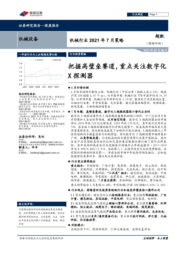 【国信证券】【20210708】机械行业2021年7月策略:把握高壁垒赛道,重点关注数字化X探测器-30页