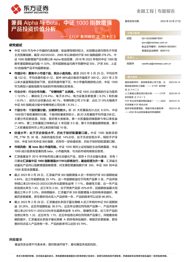 【东方证券】【20230327】《FOF系列研究之六十三》:兼具Alpha与Beta,中证1000指数增强产品投资价值分析-15页