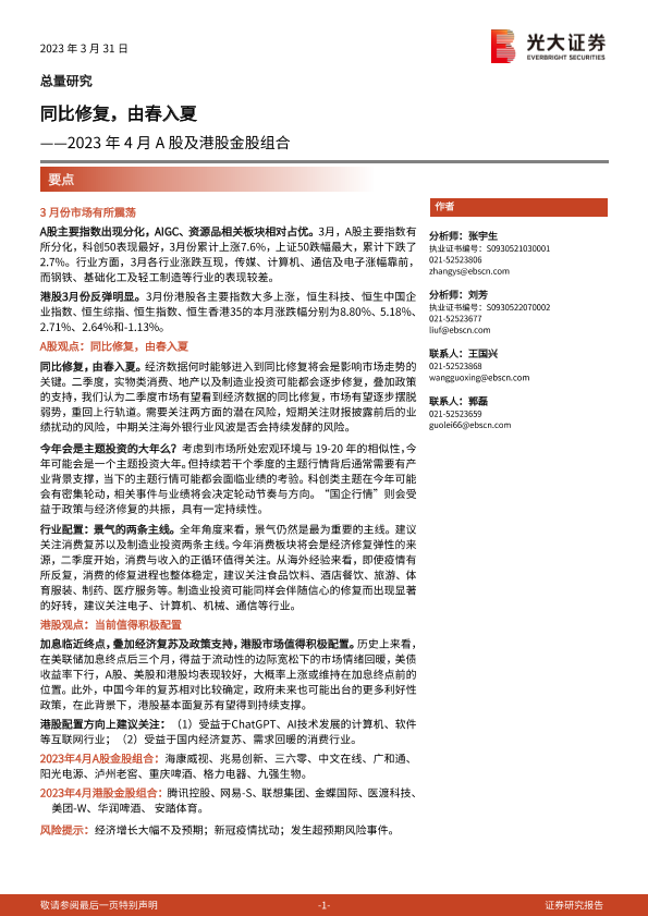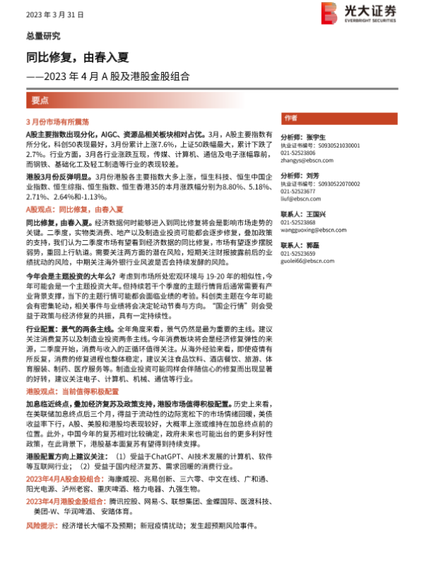 【光大证券】【20230331】2023年4月A股及港股金股组合:同比修复,由春入夏-21页