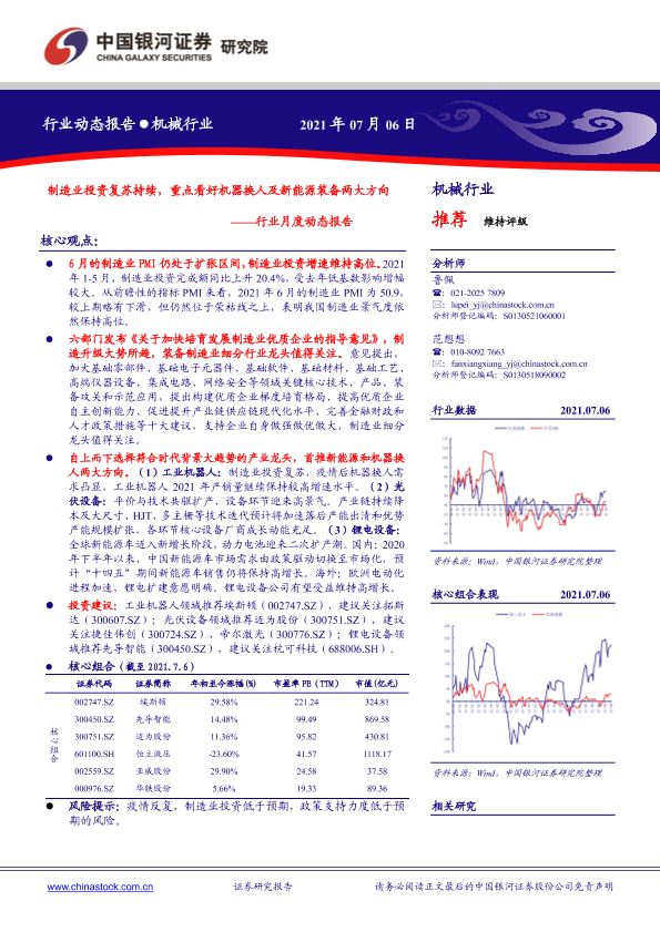 【银河证券】【20210706】机械行业月度动态报告:制造业投资复苏持续,重点看好机器换人及新能源装备两大方向-29页