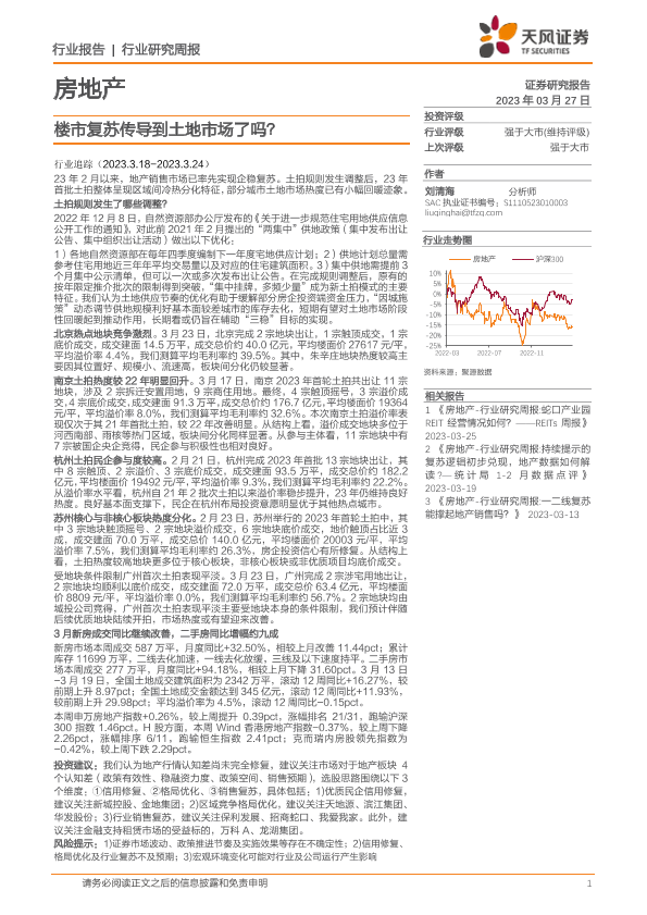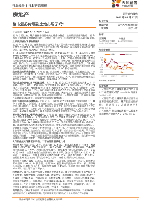 【天风证券】【20230327】房地产行业研究周报:楼市复苏传导到土地市场了吗?-21页