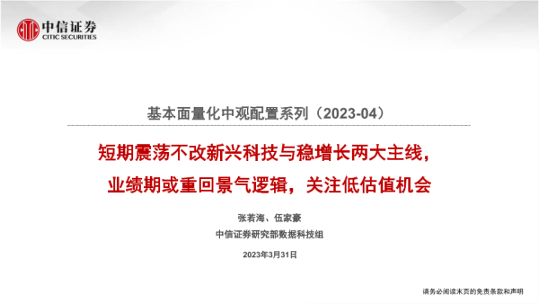 【中信证券】【20230331】基本面量化中观配置系列(2023-04):短期震荡不改新兴科技与稳增长两大主线,业绩期或重回景气逻辑,关注低估值机会-26页
