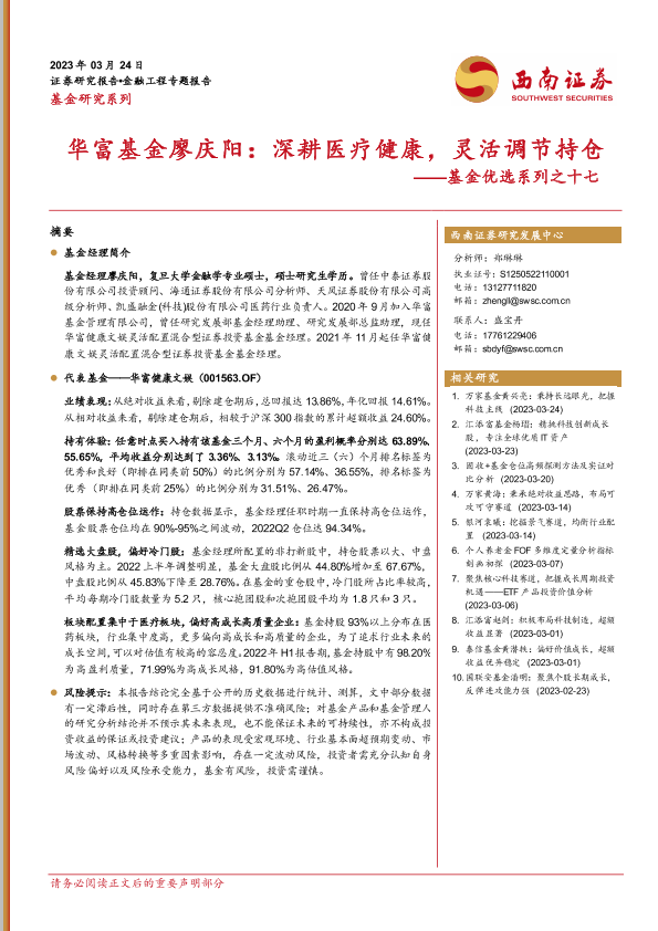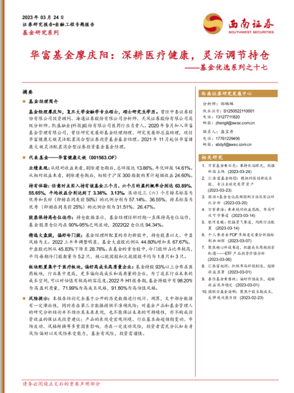 【西南证券】【20230324】基金优选系列之十七:华富基金廖庆阳,深耕医疗健康,灵活调节持仓-19页