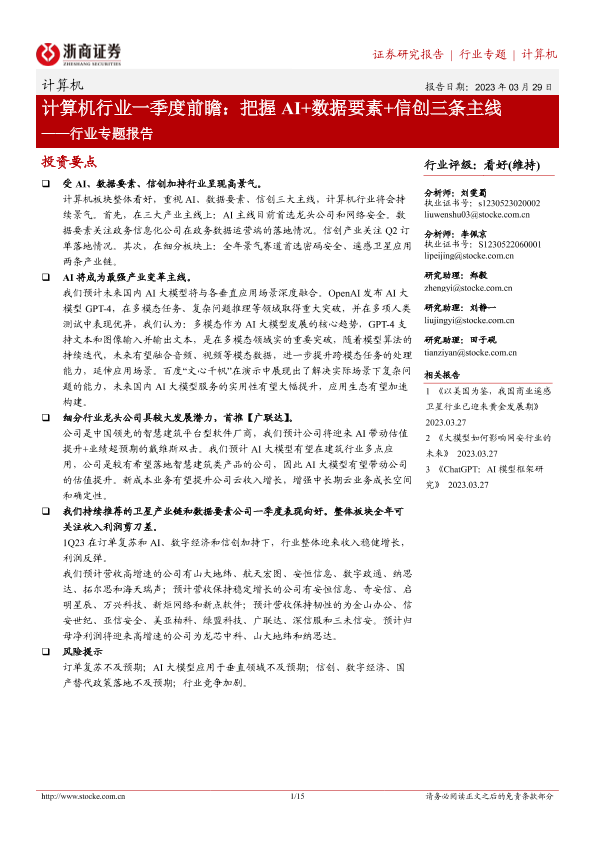 【浙商证券】【20230329】计算机行业专题报告:计算机行业一季度前瞻,把握AI+数据要素+信创三条主线-15页