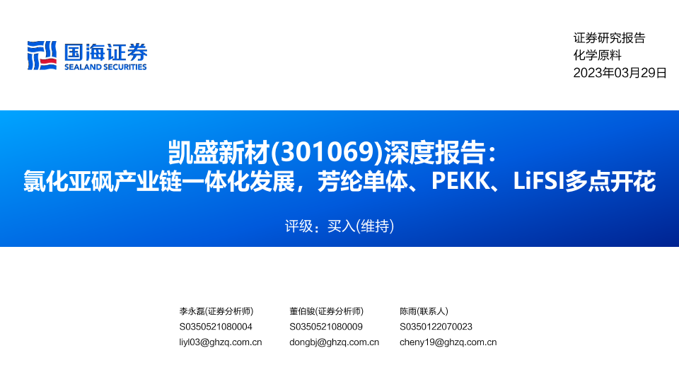 【国海证券】【20230329】凯盛新材深度报告(301069):氯化亚砜产业链一体化发展,芳纶单体、PEKK、LiFSI多点开花-67页