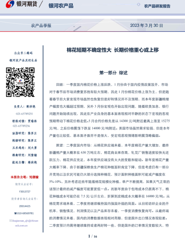 【银河期货】【20230330】农产品季报 :棉花短期不确定性大,长期价格重心或上移-16页