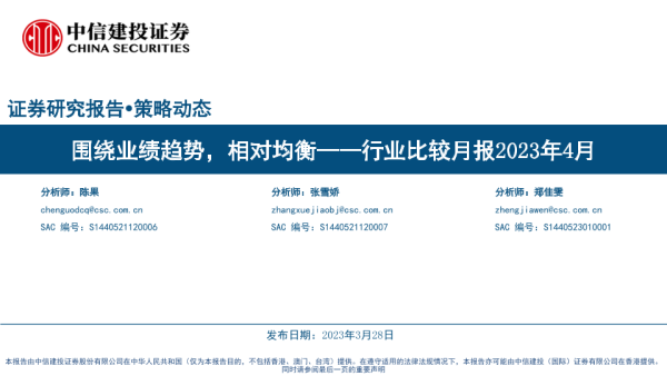 【中信建投证券】【20230328】行业比较月报2023年4月:围绕业绩趋势,相对均衡-42页