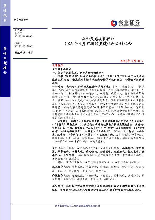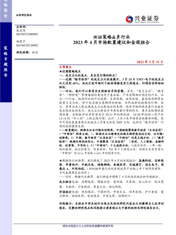 【兴业证券】【20230331】兴证策略&多行业 2023年 4月市场配置建议和金股组合-15页