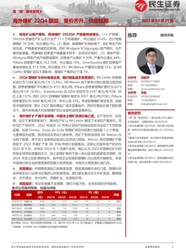 【民生证券】【20230331】有色金属行业真“锂”探寻系列8:海外锂矿22Q4跟踪,量价齐升、供应延期-27页