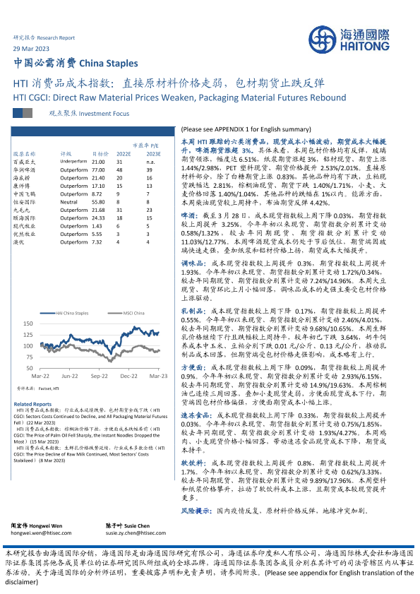 【海通国际】【20230329】中国必需消费行业:HTI消费品成本指数,直接原材料价格走弱,包材期货止跌反弹-16页