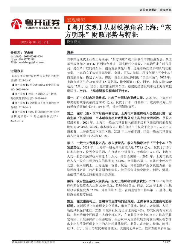 【粤开证券】【20230412】从财税视角看上海:“东方明珠”财政形势与特征-27页