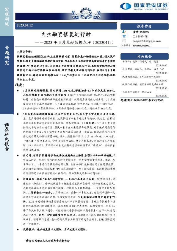 【国泰君安证券】【20230412】2023年3月社融数据点评:内生融资修复进行时-16页