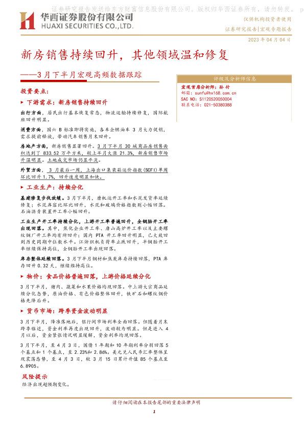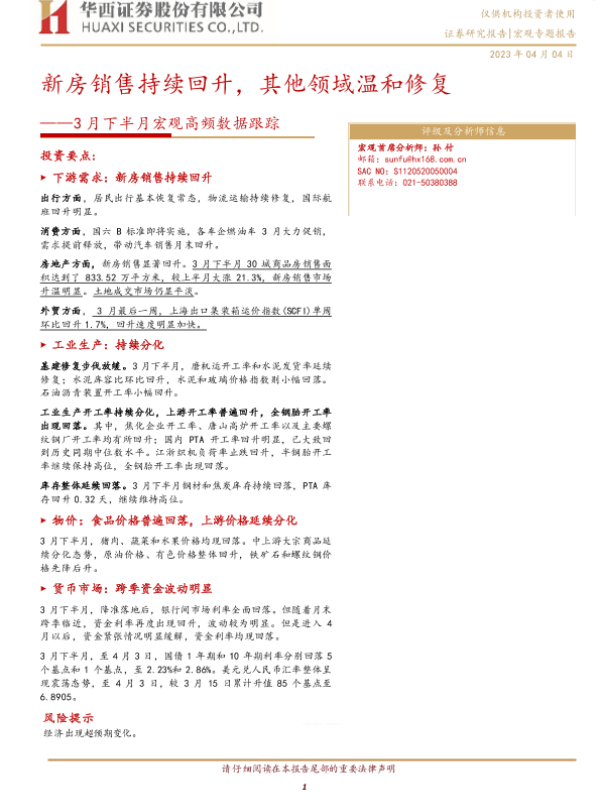 【华西证券】【20230404】3月下半月宏观高频数据跟踪:新房销售持续回升,其他领域温和修复-16页