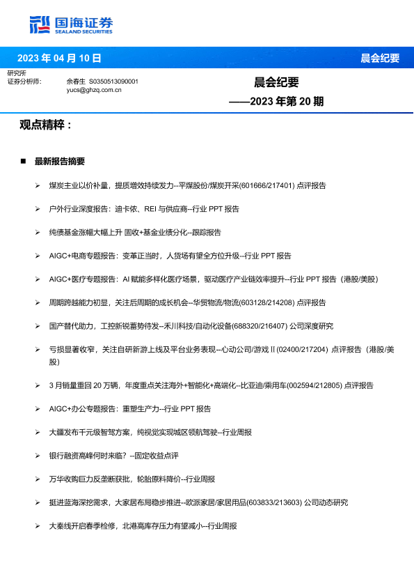 AIGC应用 户外行业 晨会纪要 煤炭行业 物流行业