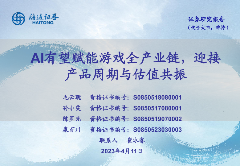 【海通证券】【20230411】传媒:AI有望赋能游戏全产业链,迎接产品周期与估值共振-21页