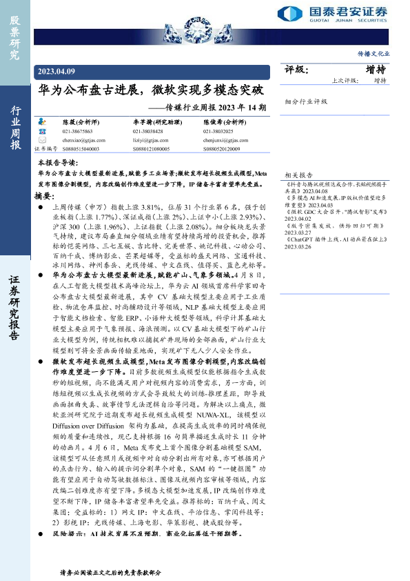【国泰君安证券】【20230409】传媒行业周报2023年14期:华为公布盘古进展,微软实现多模态突破-15页
