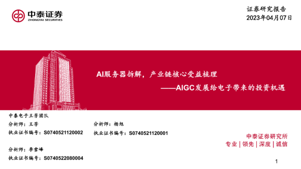 【中泰证券】【20230407】电子行业AIGC发展给电子带来的投资机遇:AI服务器拆解,产业链核心受益梳理-48页