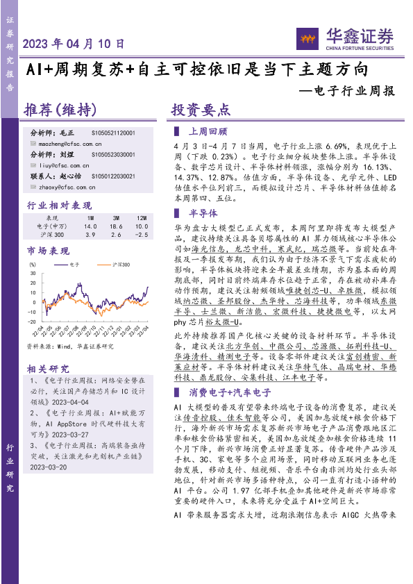【华鑫证券】【20230410】电子行业周报:AI+周期复苏+自主可控依旧是当下主题方向-43页
