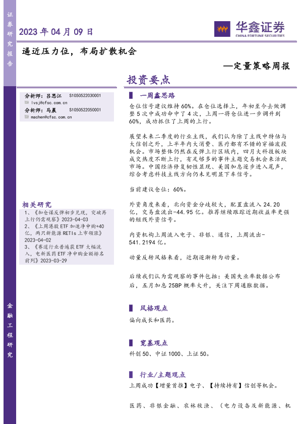 【华鑫证券】【20230409】逼近压力位,布局扩散机会 —定量策略周报-22页
