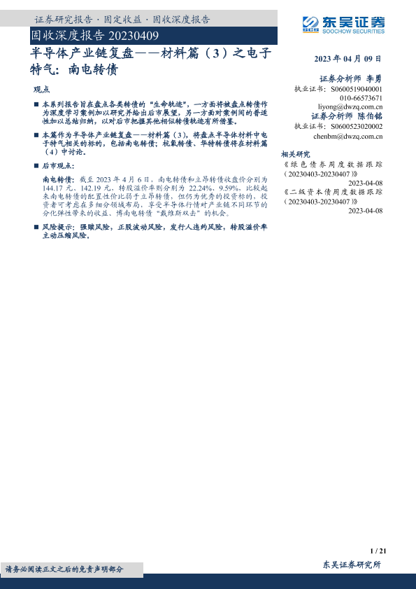 【东吴证券】【20230409】固收深度报告:材料篇(3)之电子特气,南电转债,半导体产业链复盘-21页
