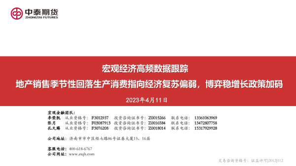 【中泰期货】【20230411】宏观经济高频数据跟踪:地产销售季节性回落生产消费指向经济复苏偏弱,博弈稳增长政策加码-25页