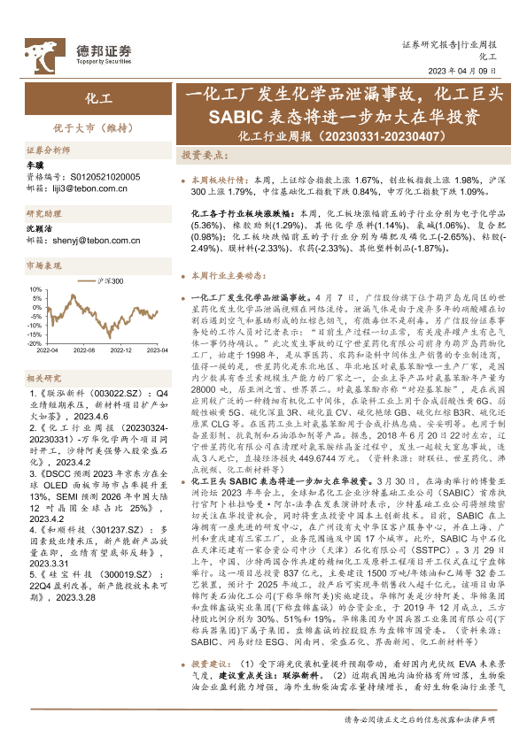 【德邦证券】【20230409】化工行业周报:一化工厂发生化学品泄漏事故,化工巨头SABIC表态将进一步加大在华投资-26页