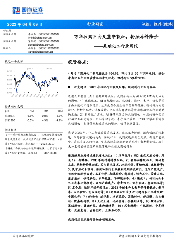 【国海证券】【20230409】基础化工行业周报:万华收购巨力反垄断获批,轮胎原料降价-56页