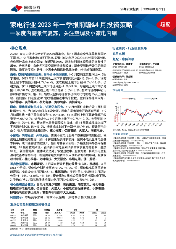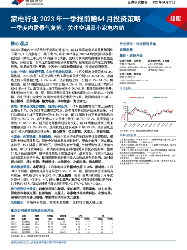 【国信证券】【20230407】家电行业2023年一季报前瞻&4月投资策略:一季度内需景气复苏,关注空调及小家电内销-22页
