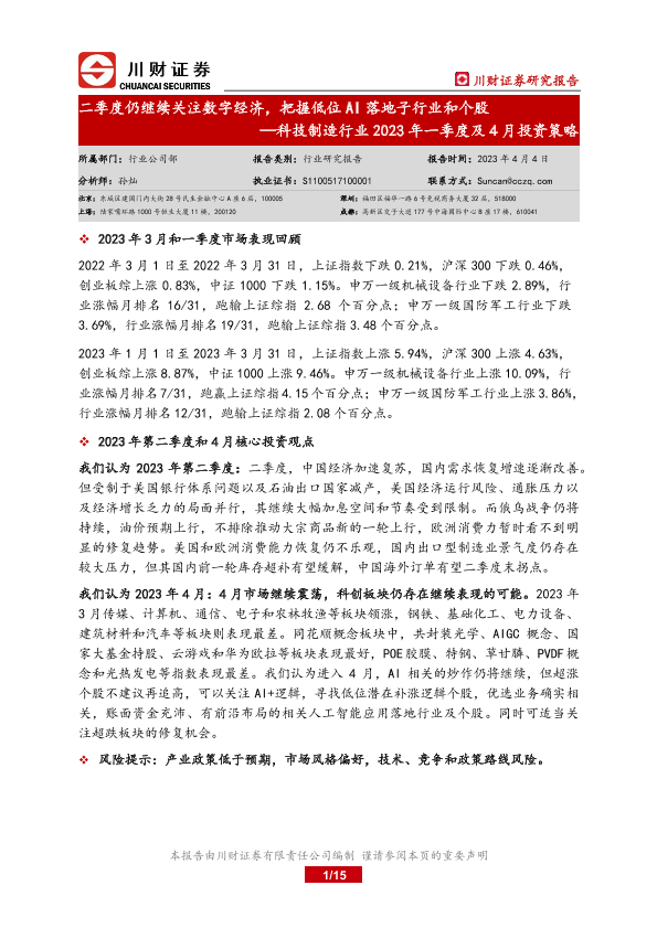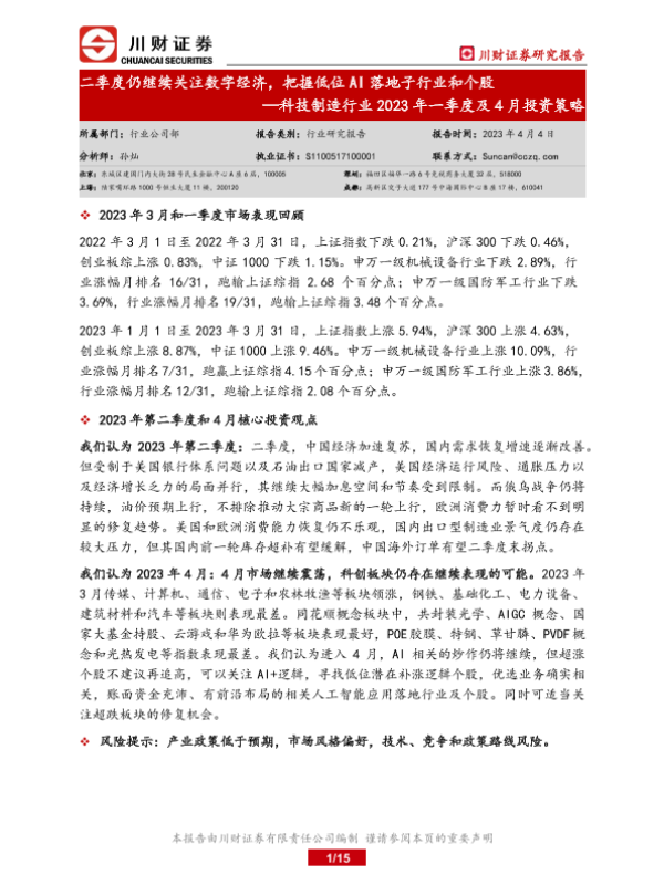 【川财证券】【20230404】科技制造行业2023年一季度及4月投资策略:二季度仍继续关注数字经济,把握低位AI落地子行业和个股-15页