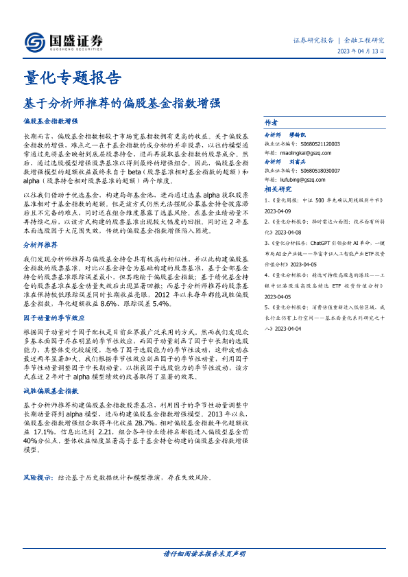【国盛证券】【20230413】量化专题报告:基于分析师推荐的偏股基金指数增强-20页