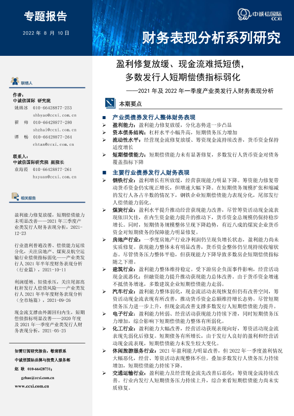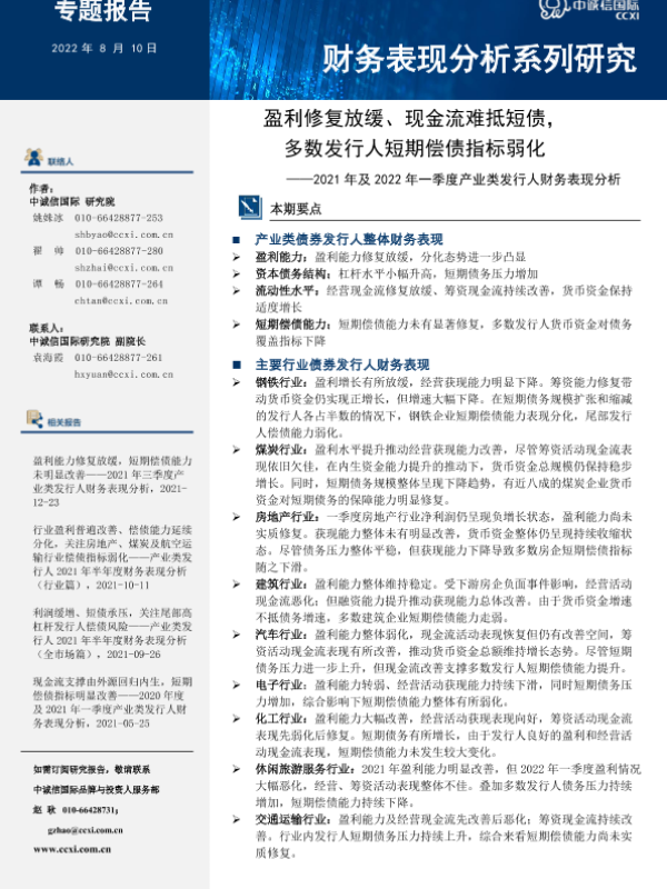 【中诚信国际】【20220810】盈利修复放缓、现金难抵短债,多数发行人短期偿债指标弱化——2021年及2022年一季度产业类发行人财务表现分析-24页
