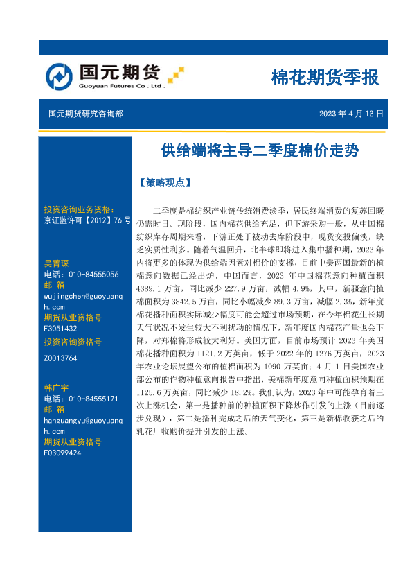 【国元期货】【20230413】棉花期货季报:供给端将主导二季度棉价走势-16页