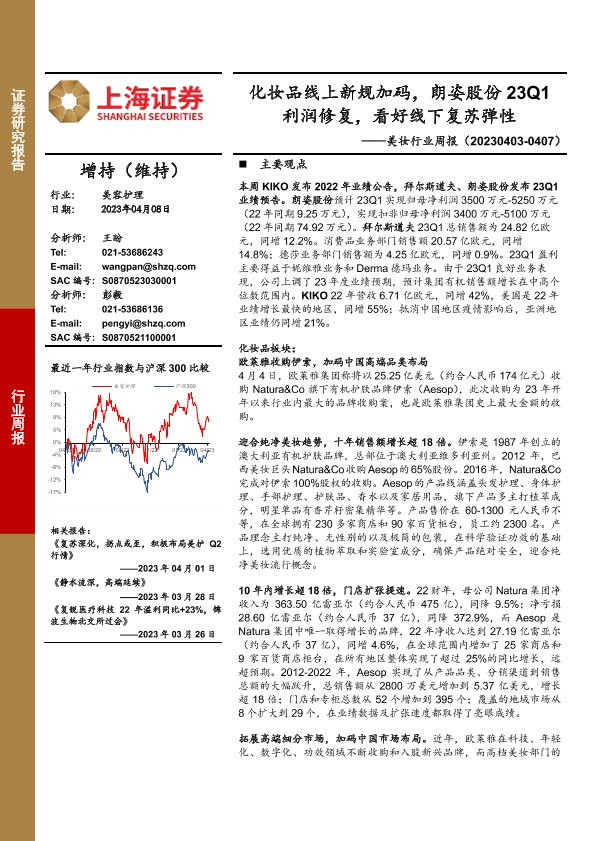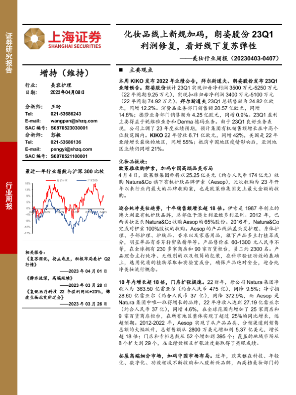 【上海证券】【20230408】美妆行业周报:化妆品线上新规加码,朗姿股份23Q1利润修复,看好线下复苏弹性-21页