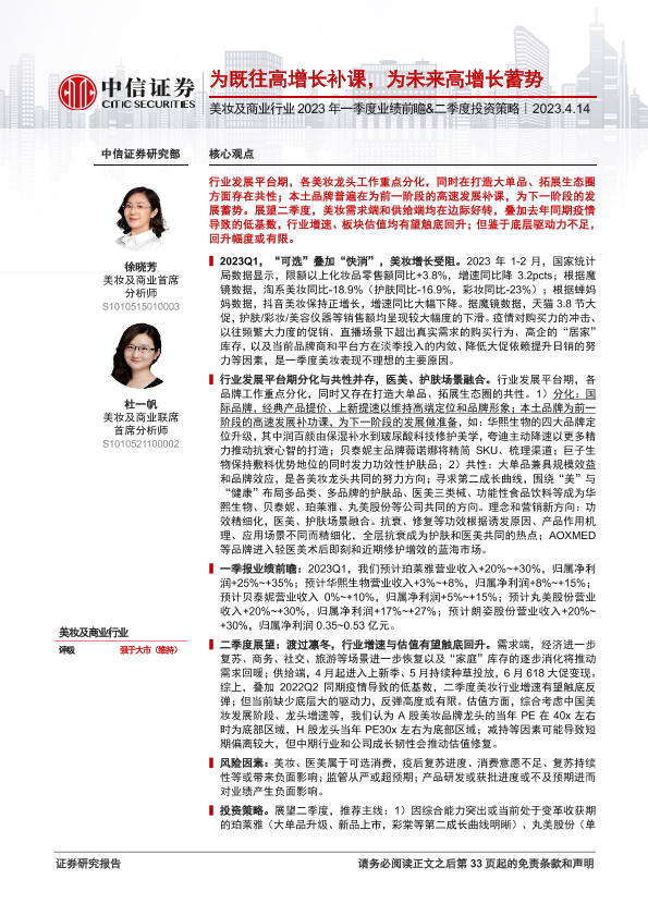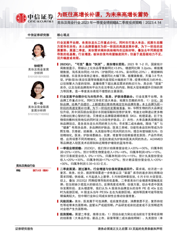 【中信证券】【20230414】美妆及商业行业2023年一季度业绩前瞻&二季度投资策略:为既往高增长补课,为未来高增长蓄势-34页