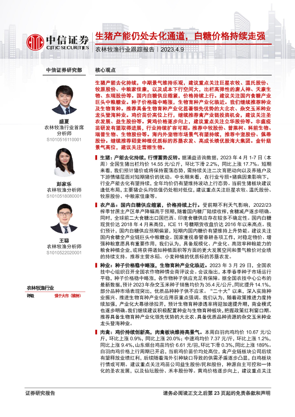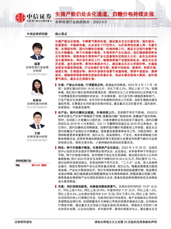 【中信证券】【20230409】农林牧渔行业跟踪报告:生猪产能仍处去化通道,白糖价格持续走强-24页