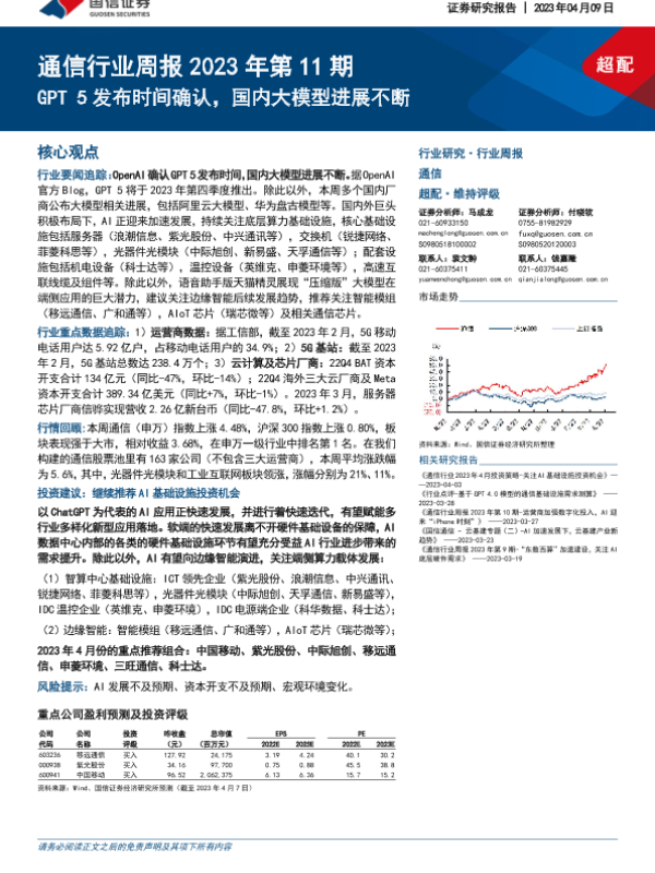 【国信证券】【20230409】通信行业周报2023年第11期:GPT5发布时间确认,国内大模型进展不断-26页