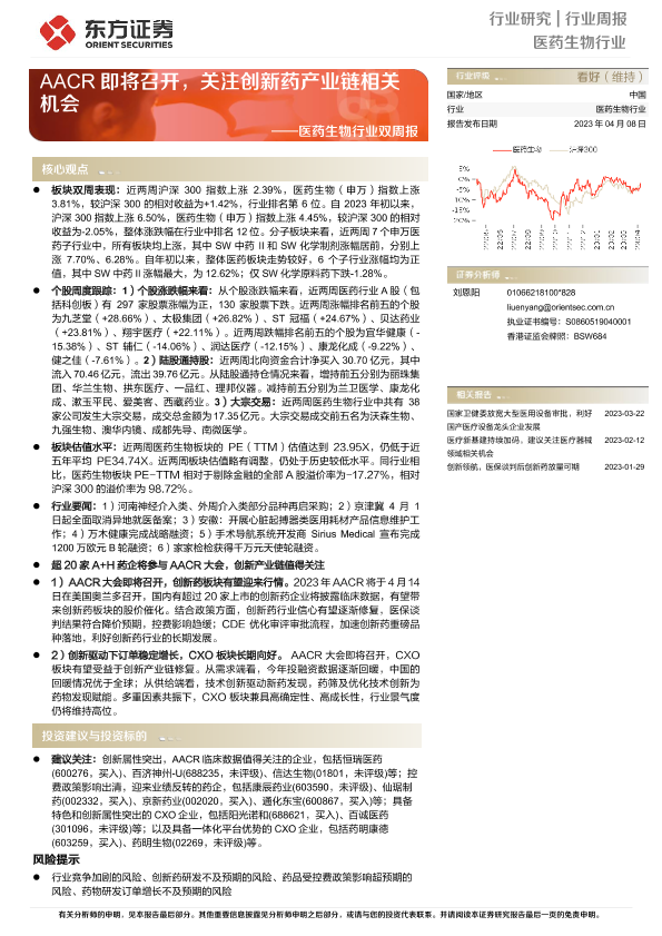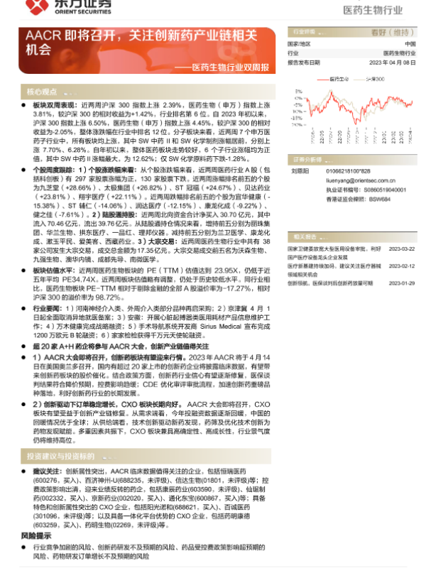 【东方证券】【20230406】医药生物行业双周报:AACR即将召开,关注创新药产业链相关机会-18页