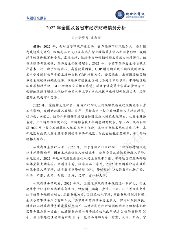 【新世纪评级】【2022】2022年全国及各省市经济财政债务分析-14页