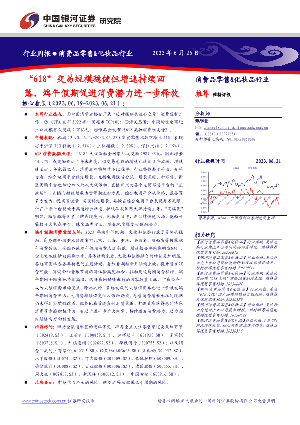 【银河证券】【20230625】消费品零售&化妆品行业周报:“618”交易规模稳健但增速持续回落,端午假期促进消费潜力进一步释放-34页