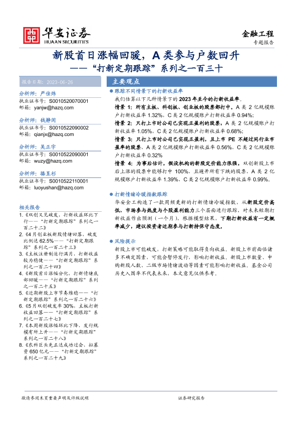 【华安证券】【20230626】“打新定期跟踪”系列之一百三十:新股首日涨幅回暖,A类参与户数回升-22页