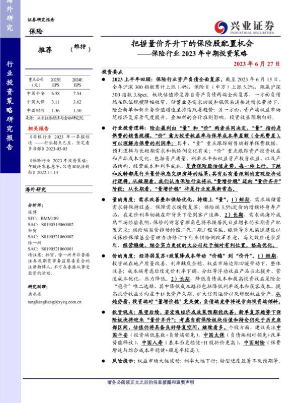 【兴业证券】【20230627】保险行业2023年中期投资策略:把握量价齐升下的保险股配置机会-38页