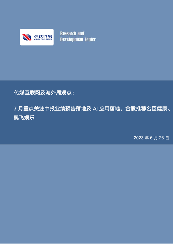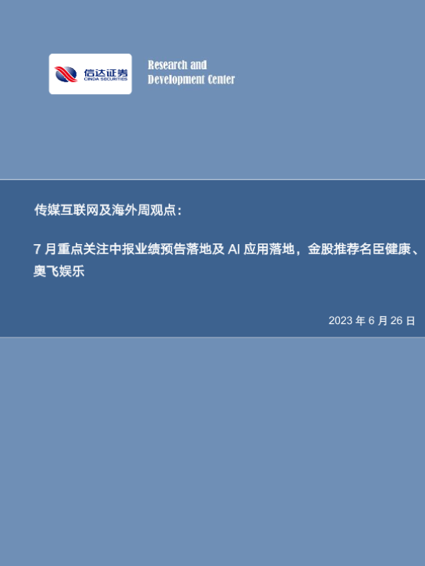 【信达证券】【20230626】传媒互联网及海外周观点:7月重点关注中报业绩预告落地及AI应用落地,金股推荐名臣健康、奥飞娱乐-24页
