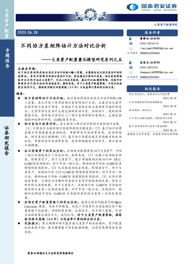 【国泰君安证券】【20230628】大类资产配置量化模型研究系列之五:不同协方差矩阵估计方法对比分析-20页
