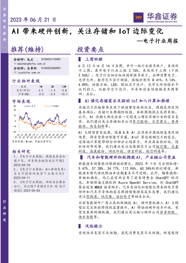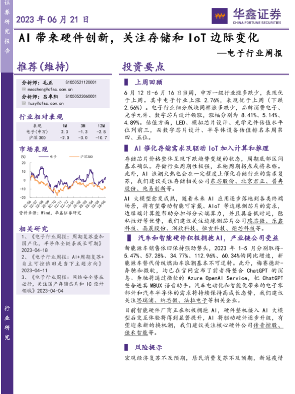【华鑫证券】【20230621】电子行业周报:AI带来硬件创新,关注存储和IoT边际变化-36页