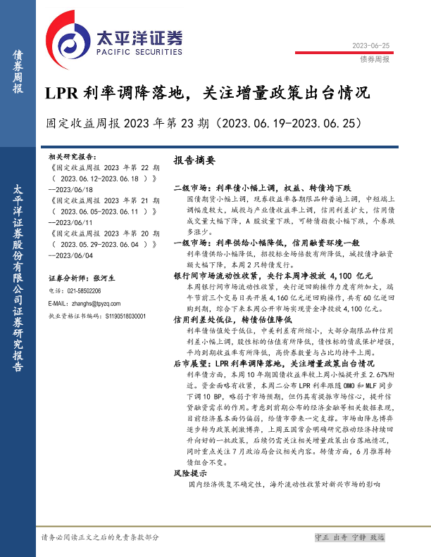 【太平洋证券】【20230625】固定收益周报2023年第23期:LPR利率调降落地,关注增量政策出台情况-22页