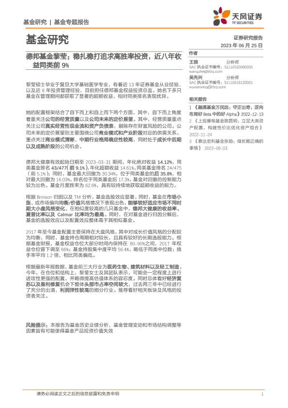 【天风证券】【20230625】基金研究:德邦基金黎莹,稳扎稳打追求高胜率投资,近八年收益同类前9%-24页