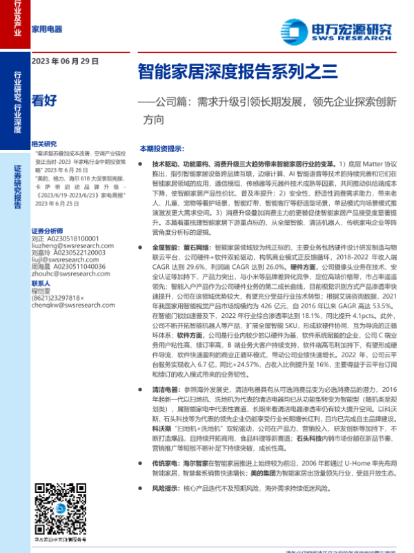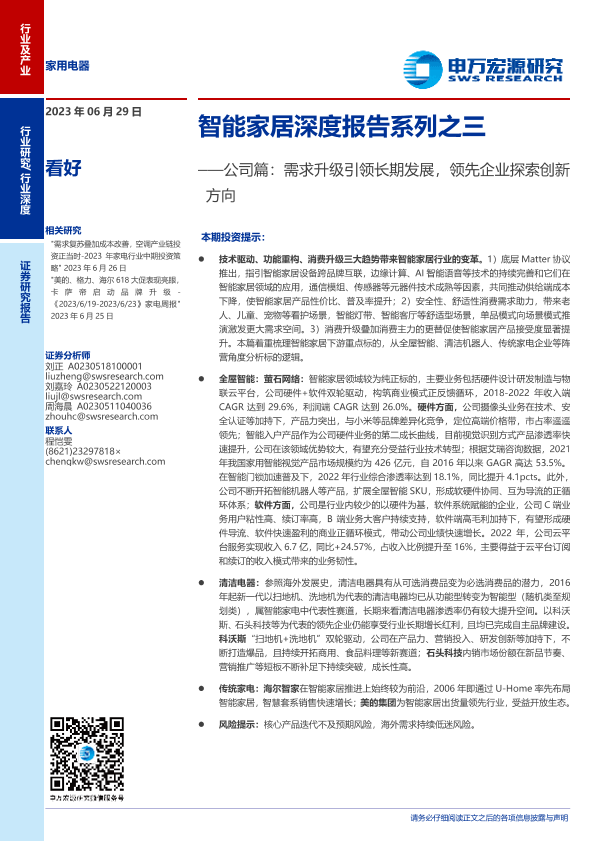【申万宏源】【20230629】家用电器行业智能家居深度报告系列之三:公司篇,需求升级引领长期发展,领先企业探索创新方向-33页