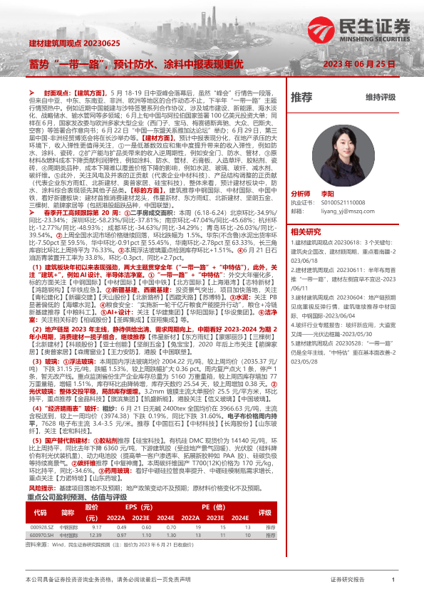 【民生证券】【20230625】建材建筑周观点:蓄势“一带一路”,预计防水、涂料中报表现更优-24页