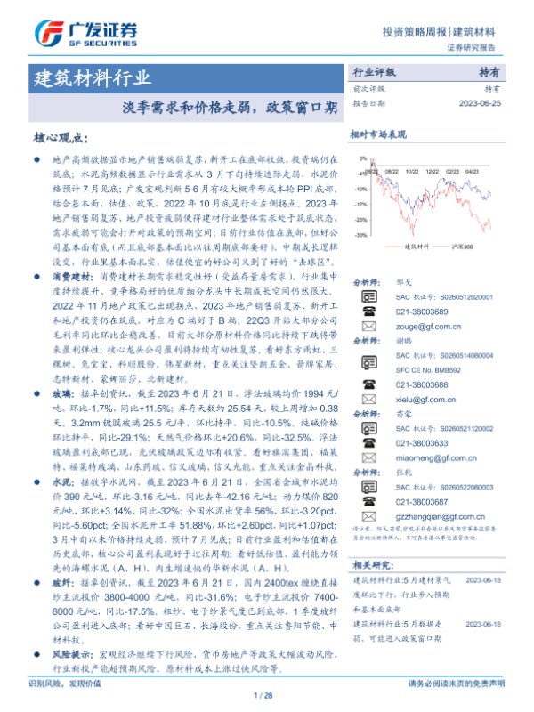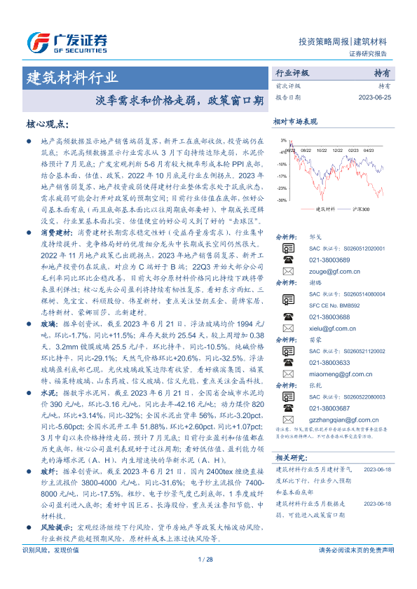 【广发证券】【20230625】建筑材料行业投资策略周报:淡季需求和价格走弱,政策窗口期-28页