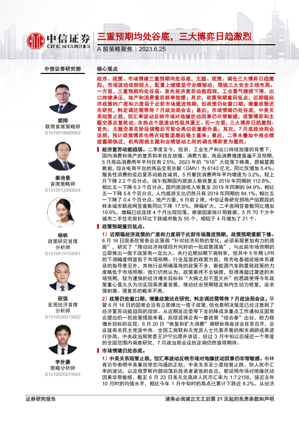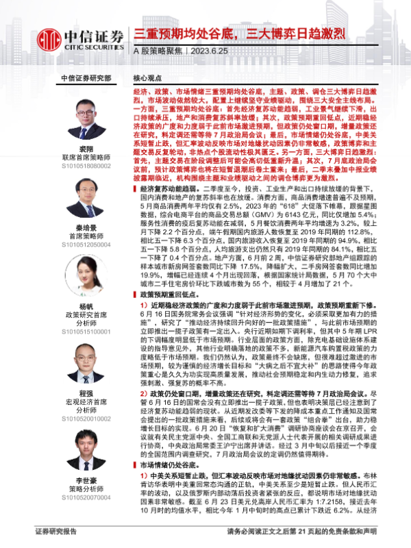【中信证券】【20230625】A股策略聚焦:三重预期均处谷底,三大博弈日趋激烈-22页